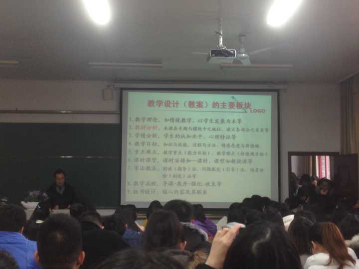 郑流爱简要地给大家教学设计的教材分析、学情分析、教学目标等9大模块,详细讲解了教学目标的制定及注意事项。在教学目标的制定中需注意:第一, 按照三维的角度进行;第二,目标需具体、可操作化、避免空洞;第三,目标与重难点相结合,减少目标之间的串位和重叠。“形成独立思考,团结探究的好习惯”,郑流爱给同学们展示某中学教案中的教学目标,引起大家思考。他解释道:此目标过于空泛,需具体为初步体会独立思考在化学课中重要性,并通过其他的具体形象的例子向大家展示教学目标的叙写要求。
