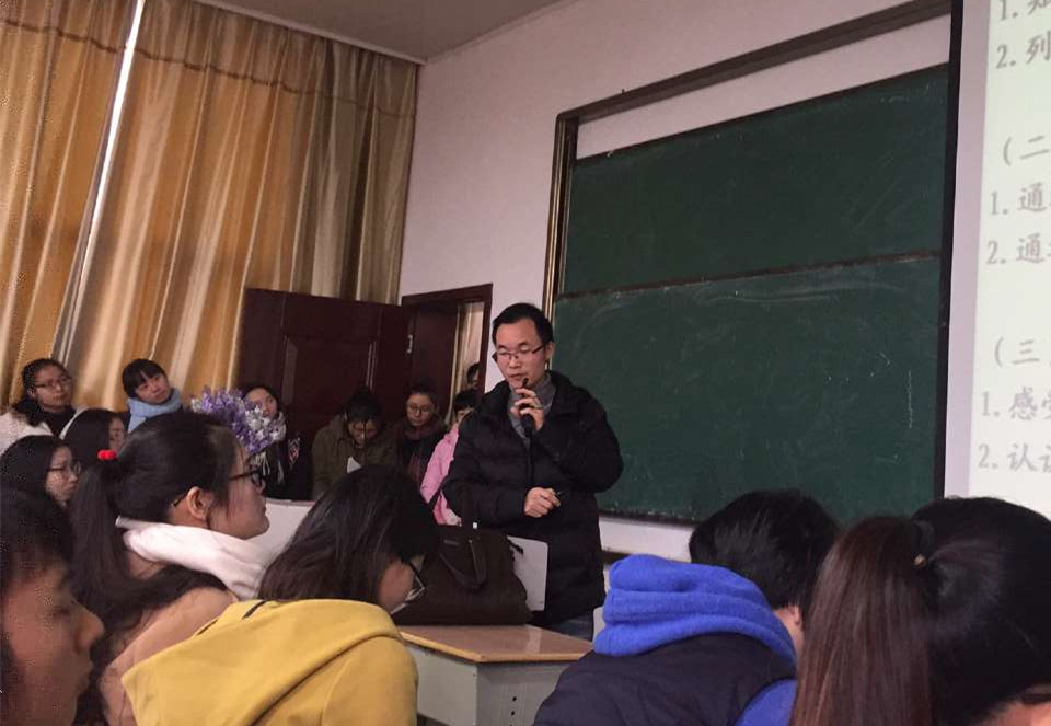 郑流爱通过生动的讲解以及具体的案例分析给同学们传授了教师应聘及面试的技巧和知识,从语言、手势、神态、走动、时间控制等方面给了大家一些建议。教室里满满一堂,带领大家走进教师备课、说课和上课的技术殿堂。