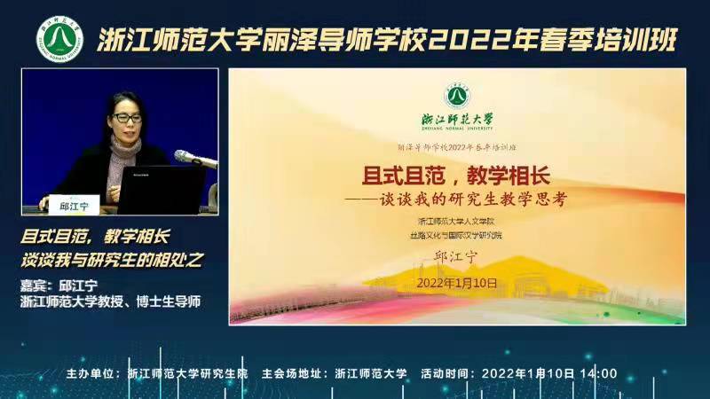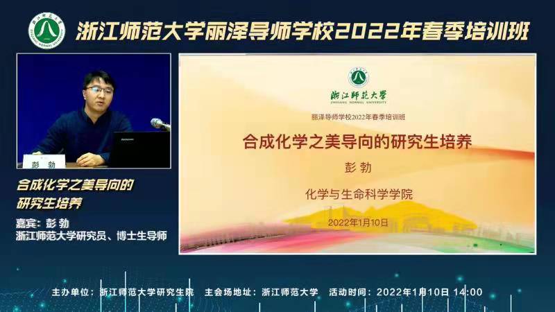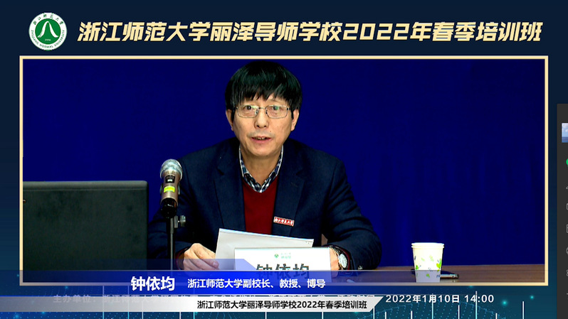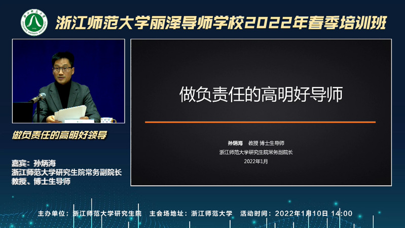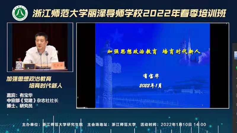为了全面落实导师是研究生培养第一责任人要求,努力建设一支师德高尚、学识深厚、治学严谨、指导有方的高素质研究生导师队伍,2022年1月10日,浙江师范大学以线上方式召开丽泽导师学校第三期导师培训会。省学位办主任吕华来电表示祝贺,并对我校新时代导师专业成长提出了殷切希望。钟依均副校长出席会议并致辞,中宣部《党建》杂志社社长有宝华和我校博士生导师、教育部青年长江学者彭勃、邱江宁作了专题报告。会议由研究生院常务副院长孙炳海主持。