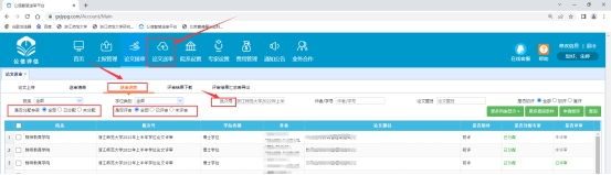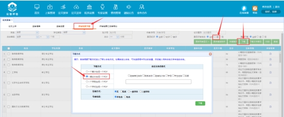 点击“评审结果下载”可查看、下载评阅结果。筛选评审完毕的记录,可下载评审结果,建议选择‘一篇论文生成一个PDF’下载。