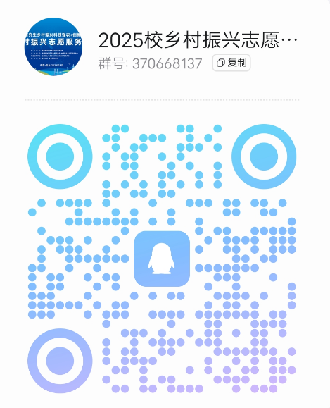 各参赛团队于初赛前在“中国研究生创新实践系列大赛”官网平台上进行注册并完成报名。官网报名地址为:https://cpipc.acge.org.cn/login/signUp。一经报名,参赛信息将无法修改。报名的同学加入“2025校乡村振兴志愿服务技能大赛群”(群号:370668137,二维码见下),比赛相关通知将于该群发布。