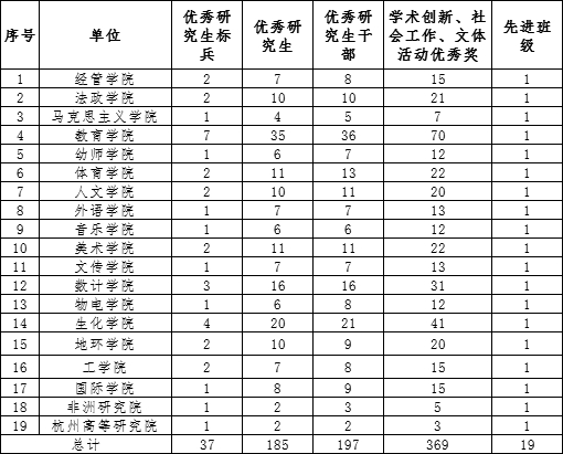 优秀研究生标兵等各类荣誉称号,表彰德智体美等方面表现优秀的研究生,具体按照《浙江师范大学研究生荣誉称号评选办法(试行)》